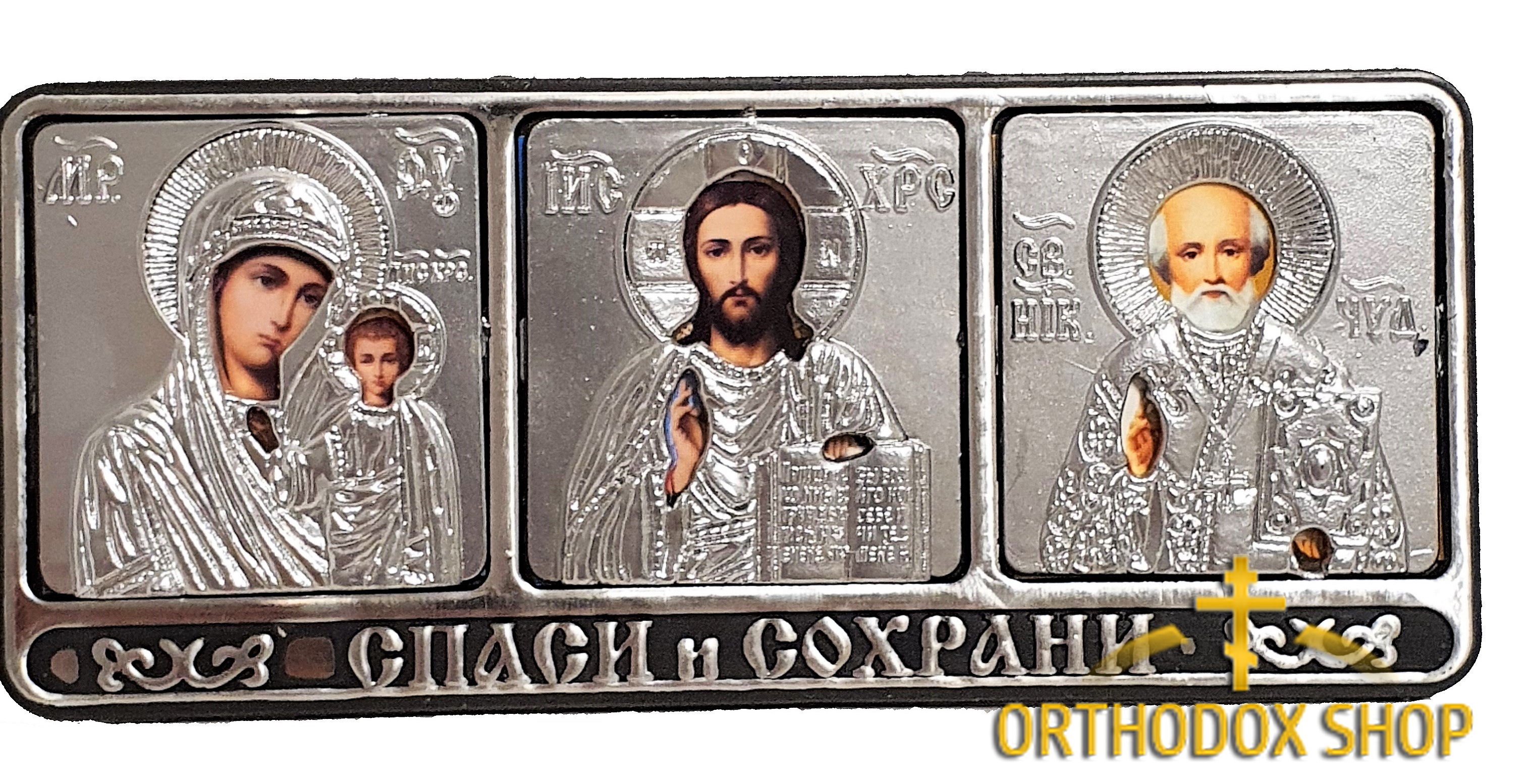 Автомобильная Икона Богоматерь Казанская, Господь Вседержитель и Николай Чудотворец, Освященная